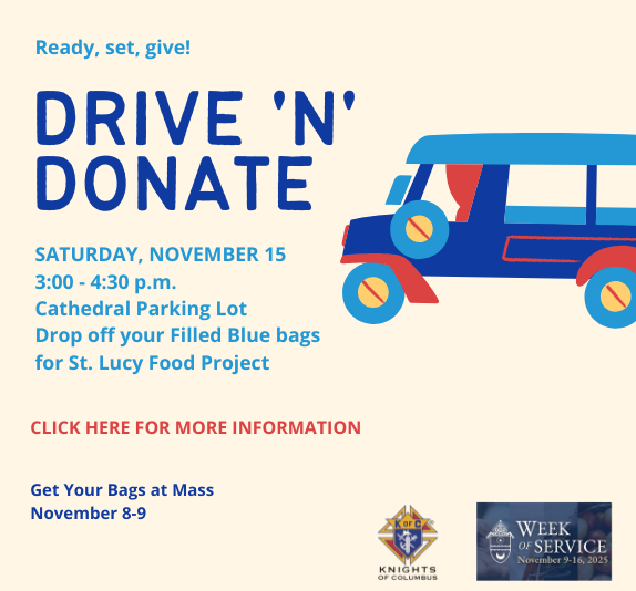 As part of the diocesan Week of Service, the Cathedral is hosting a Drive Through Food Drive on Saturday, November 15, to benefit the St. Lucy Food Project. In conjunction with the Knights of Columbus, we are handing out the familiar St. Lucy Blue Bags at all Masses the weekend of November 8-9. We are seeking donations of non-perishable items for the food insecure in our communities.